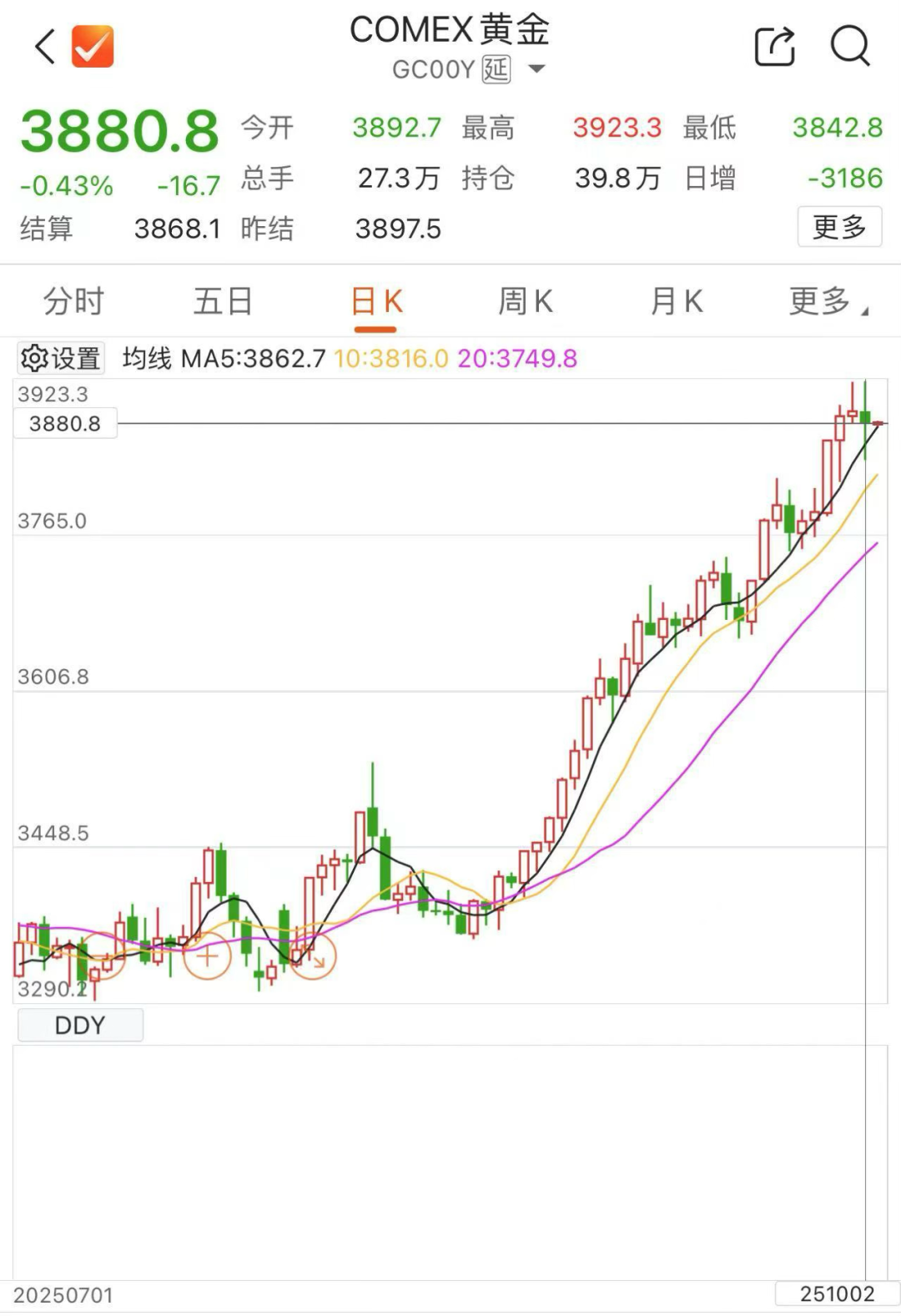 隔夜,尽管小幅收跌,但国际金价仍创下盘中新高。伦敦现货黄金最高逼近3900美元/盎司;COMEX黄金期价则升破3923美元/盎司。