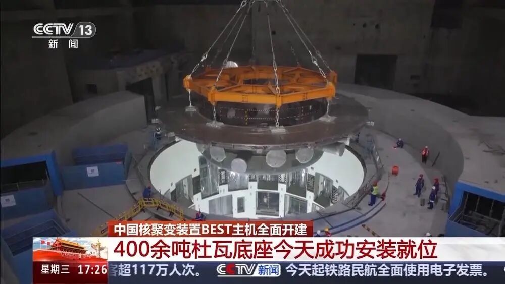 据央视新闻报道,10月1日,位于安徽合肥的紧凑型聚变能实验装置BEST项目建设取得关键突破,其装置主机关键部件——杜瓦底座研制成功并于1日上午完成吊装,成功精准落位安装在BEST装置主机大厅内,标志着项目主体工程建设步入新阶段。