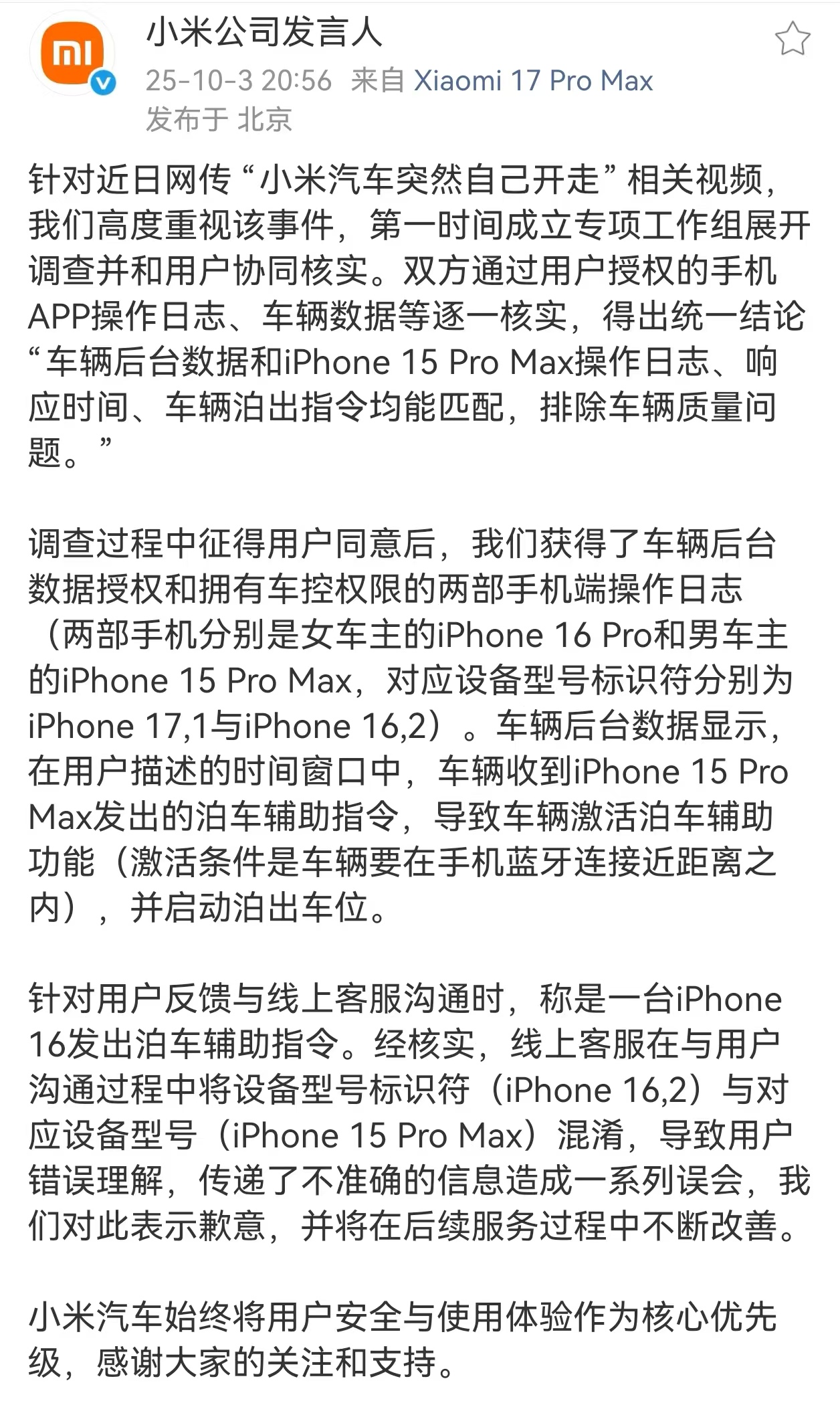 近日,针对网传的“小米汽车突然自行开走”相关视频,“小米公司发言人”10月3日晚发文称,小米公司第一时间成立专项工作组展开全面调查,并与涉事用户协同核实。经技术团队与用户双方通过车辆后台数据、手机APP操作日志等多维度交叉验证,最终确认事件系用户手机发出泊车指令触发,排除车辆本身存在质量问题的可能性。