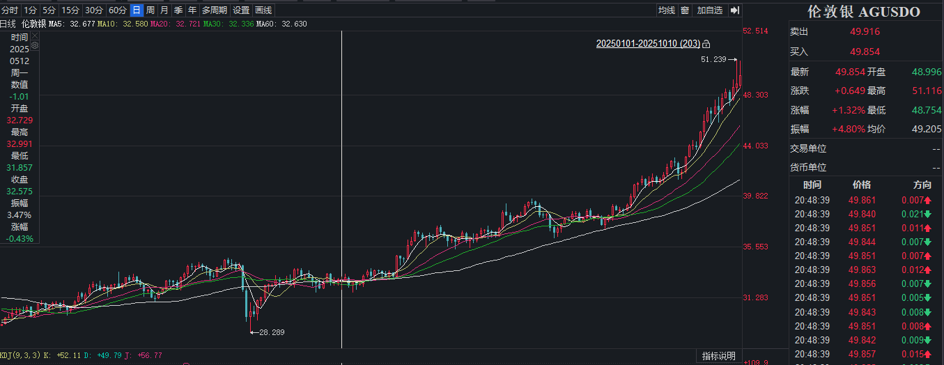 北京时间10月9日,伦敦现货白银突破50美元/盎司大关,一度站上51美元高位,创历史新高,但随后有所回调。