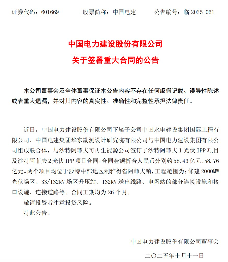 具体来看,中国电建下属子公司中国水电建设集团国际工程有限公司、中国电建集团华东勘测设计研究院有限公司与中国电力建设集团有限公司组成联合体,与沙特阿菲夫可再生能源公司签订了沙特阿菲夫1光伏和沙特阿菲夫2光伏项目合同。