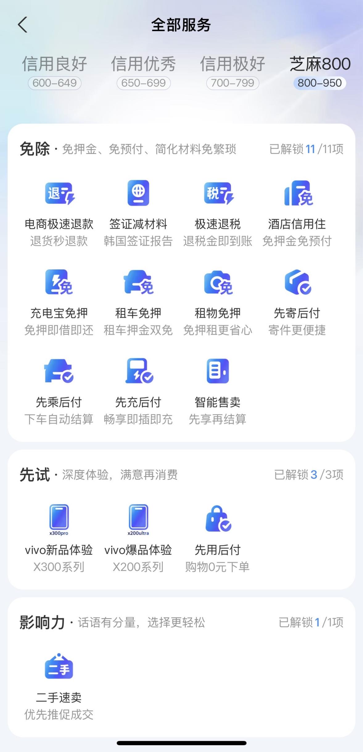 景福介绍,“芝麻800”在相关服务上主要体现三大特点。首先,“免除”主张聚焦信用场景拓宽。除了延续过去十年芝麻信用免押、先用后付、签证便利等基础服务,未来将为“芝麻800”高信用分用户拓展更多服务场景,例如消费健康医疗领域的“先诊疗后付费”,回收领域通过信用保障帮助用户规避“到手刀”风险等,进一步丰富用户生活服务体验。