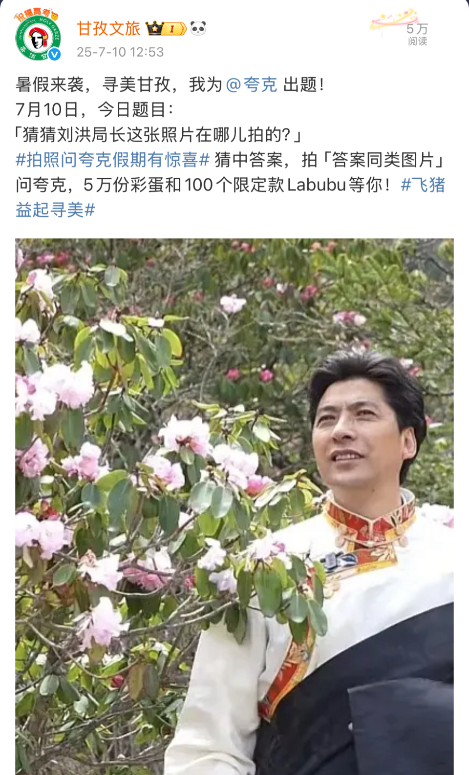 “云绕雅拉的星空有多美?用夸克AI扫一扫,猜猜刘洪局长在哪张照片里?”2025年7月,一场有趣的文旅推广活动在飞猪平台及小红书、微博等多渠道展开,2亿次的曝光量让康定再次成为焦点。