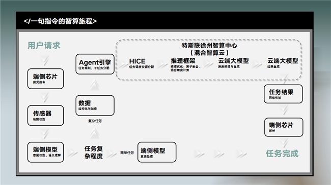 当端侧模型判断这是一个复杂任务时,端侧芯片便会对数据进行预处理和安全加密,并启动协同流程,通过无线网络将加密后的请求上传至云端。