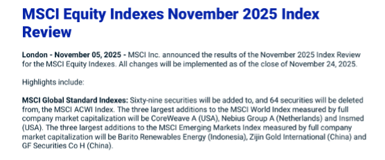 北京时间11月6日早间,国际指数编制公司MSCI公布了11月指数审核变更结果。在本次调整中,MSCI中国A股指数新纳入17只标的,剔除16只。本次调整结果将于2025年11月24日收盘后生效。