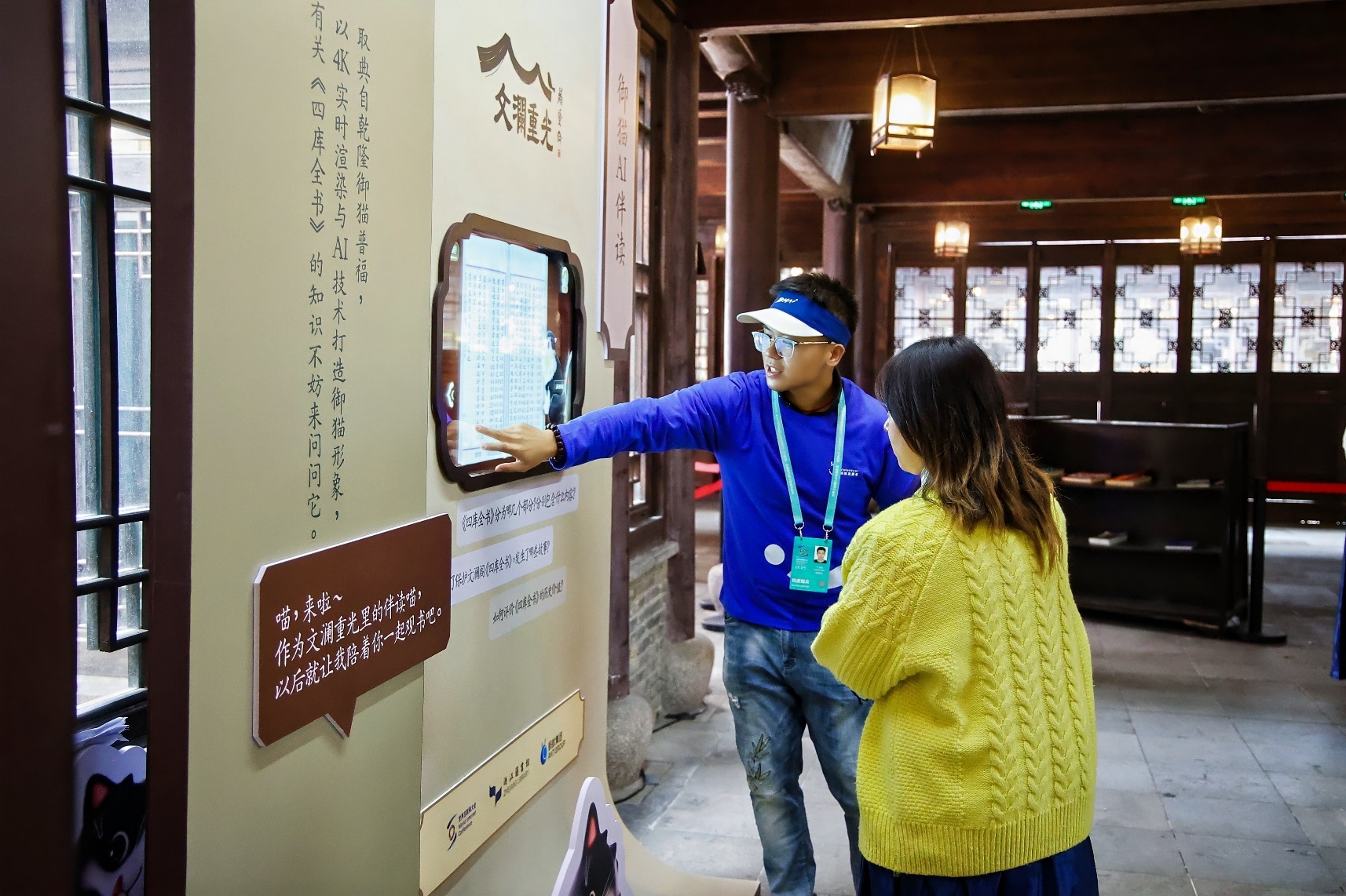 蚂蚁集团志愿者现场为游客介绍乾隆御猫AI伴读功能