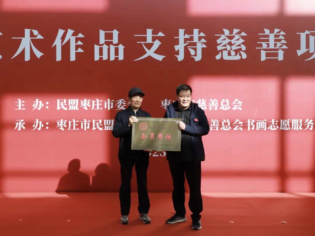 枣庄市人大原副主任张宝民向枣庄市民盟书画院授予“枣庄市慈善总会会员单位”牌匾