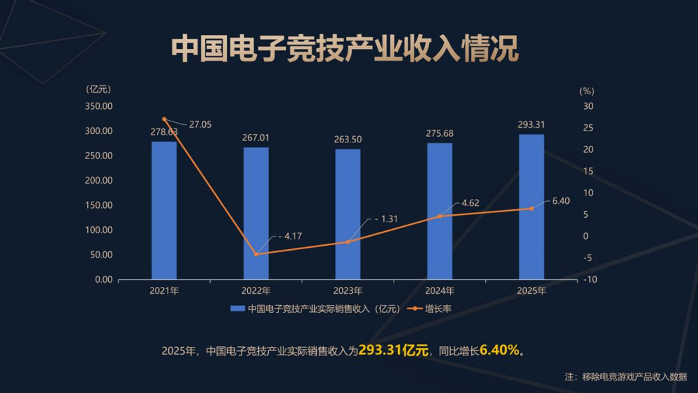 首先来看收入部分。2025年,中国电子竞技产业收入为293.31亿元,同比增长6.40%,实现稳健增长。