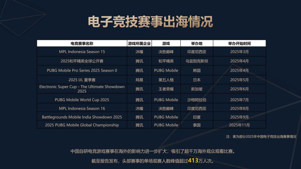 中国自研电竞游戏赛事的海外影响力进一步扩大,吸引超千万海外观众观赛,头部赛事单场观赛人数峰值超413万人次。
