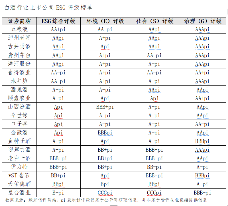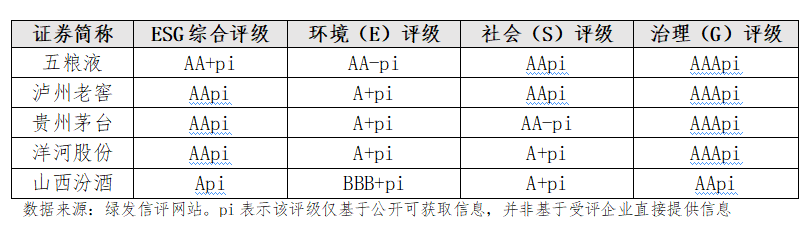 根据绿发信评网站数据,5家头部白酒企业中,五粮液获得最高的AA+pi评级,泸州老窖、贵州茅台和洋河股份均获得AApi评级,山西汾酒则获得A+pi评级,被拉开差距。