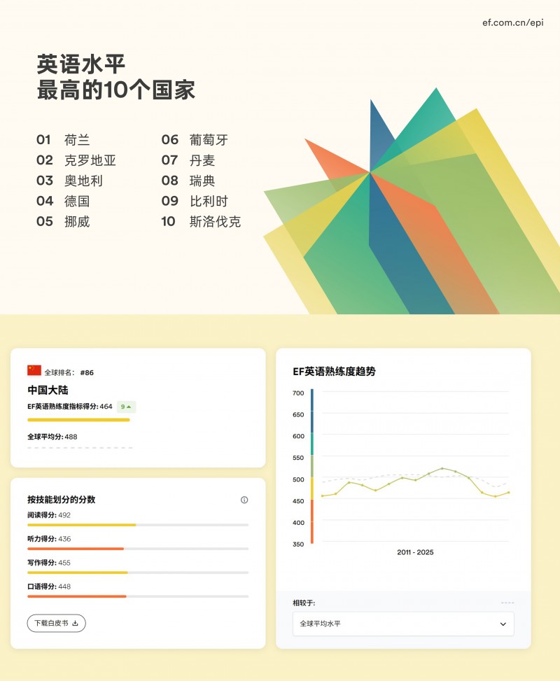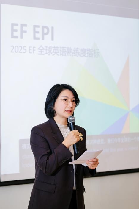 近日,EF 中国于亚太区上海总部举办 2025 年EF英语熟练度指标(EF EPI)发布会,正式发布《2025 EF EPI 英语熟练度指标报告》。EF企业学习解决方案大中华区副总裁窦逸姝女士、EF成人英语培训总裁 Johan Wilhelmsson先生、EF Efekta 教育集团首席学术官 Christopher McCormick(梅熙)博士等出席本次发布会,并荟聚了小红书商业教育及到综行业群总经理纳什先生、前辉瑞成熟药品事业部全球CHRO吕红女士、小米谷仓学院总顾问(原京东大学执行校长)马成功先生、《培训》杂志副主编、中国企业人才发展智库总经理顾邦友先生等各界行业嘉宾,共同解读AI时代下,全球成人英语水平现状,洞察中国成人英语学习新趋势,探讨企业全球化战略与相应人才战略的相互价值赋予。
