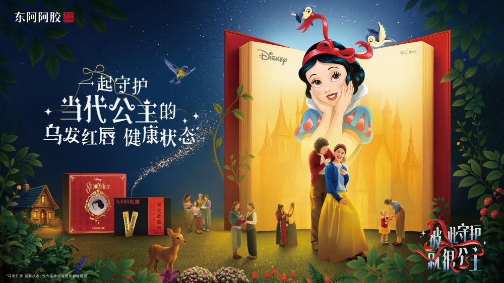2025 年,东阿阿胶携手迪士尼白雪公主IP,通过品牌TVC、系列海报和联名礼盒,聚焦职场、家庭、校园等不同场景,还原女性之间真实的守护现场,将“乌发红唇健康状态”与白雪公主形象深度融合,直击消费者“补血圣药”的核心需求痛点,实现从心智传达到效果转化。