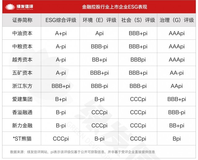 绿发信评主动评级结果显示,金融控股行业整体ESG评级缺少AA-pi以上级别企业,级别主要分布在A+到BBB+pi区间和B+pi到CCCpi区间,呈现明显的两极分化。其中,中油资本获A+pi评级;中粮资本、越秀资本和五矿资本获A-pi评级;浙江东方获BBB+pi评级;爱建集团、香溢融通、新力金融和*ST熊猫四家企业因ESG相关信息披露不足处于B+pi至CCCpi区间。