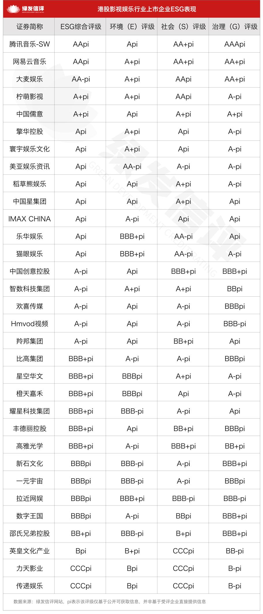 绿发信评主动评级结果显示,32家港股影视娱乐上市企业ESG主动评级多分布于BBBpi以上,行业最高评级为AApi,由腾讯音乐-SW和网易云音乐获得;大麦娱乐获AA-pi评级;柠萌影视和中国儒意获A+pi评级;8家企业获Api评级,分别是擎华控股、寰宇娱乐文化、美亚娱乐资讯、稻草熊娱乐、中国星集团、IMAX CHINA、乐华娱乐和猫眼娱乐;5家企业获得A-pi评级,分别是中国创意控股、智数科技集团、欢喜传媒、Hmvod视频和羚邦集团;6家企业获得BBB+pi评级,分别是比高集团、星空华文、橙天嘉禾、耀星科技集团、丰德丽控股和高雅光学。此外,新石文化、一元宇宙、拉近网娱和数字王国获BBBpi评级,邵氏兄弟控股获BB+pi评级,英皇文化产业获Bpi评级,力天影业和传递娱乐获CCCpi评级。