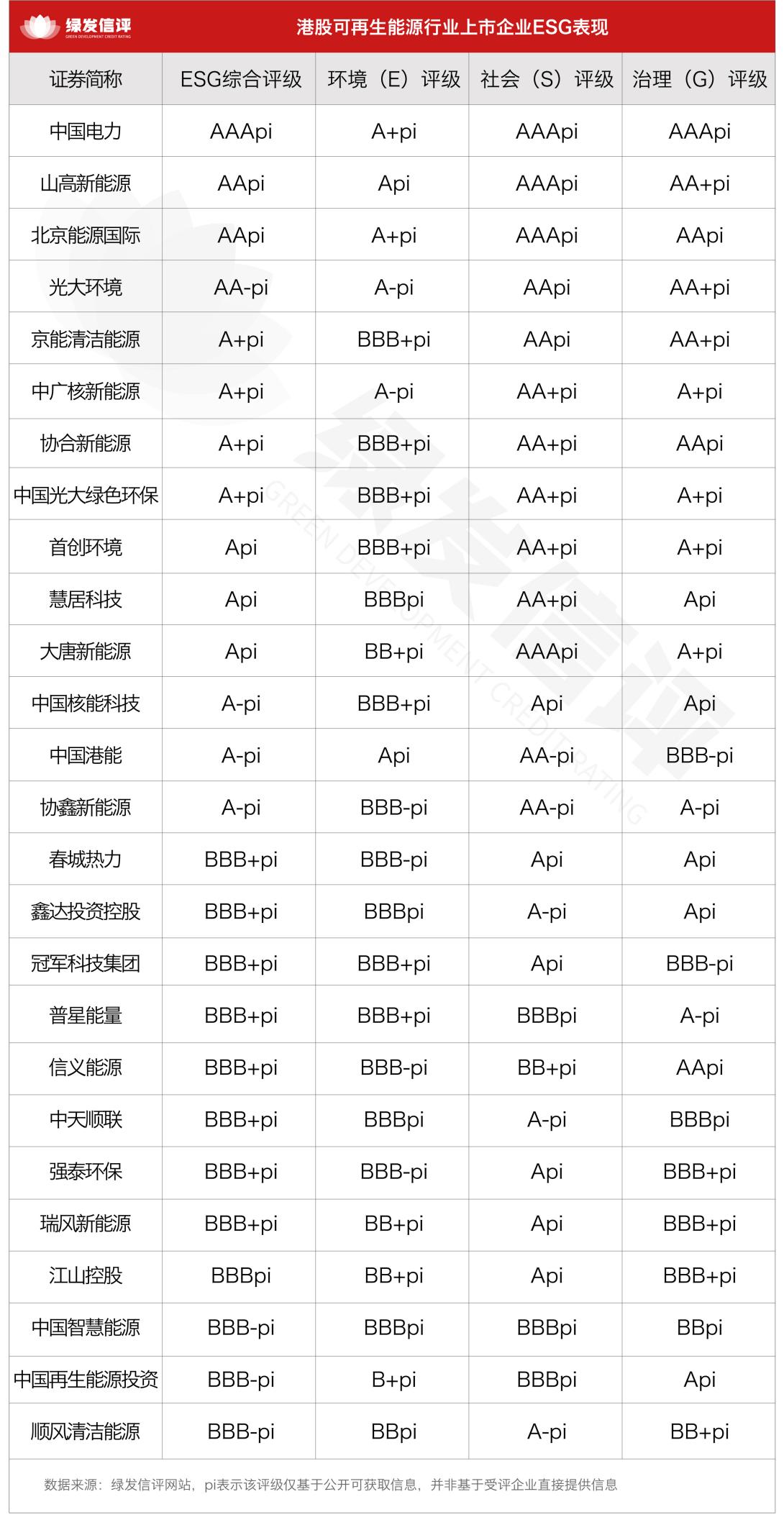 评级结果显示,港股可再生能源行业ESG评级分布呈现清晰的梯度特征。第一梯队由AAApi及AApi企业构成,中国电力以AAApi评级领跑行业,山高新能源和北京能源国际紧随其后,评级均为AApi,成为行业ESG实践的标杆力量;第二梯队涵盖评级AA-pi到A+pi的企业,光大环境获得AA-pi评级;京能清洁能源、中广核新能源、协合新能源、中国光大绿色环保四家企业获A+pi评级;第三梯队为综合评级Api至A-pi企业,其中首创环境、慧居科技、大唐新能源获得Api;中国核能科技、中国港能、协鑫新能源获得A-pi;第四梯队为综合评级BBB+pi至BBB-pi企业,包括春城热力、鑫达投资控股、冠军科技集团等12家企业。