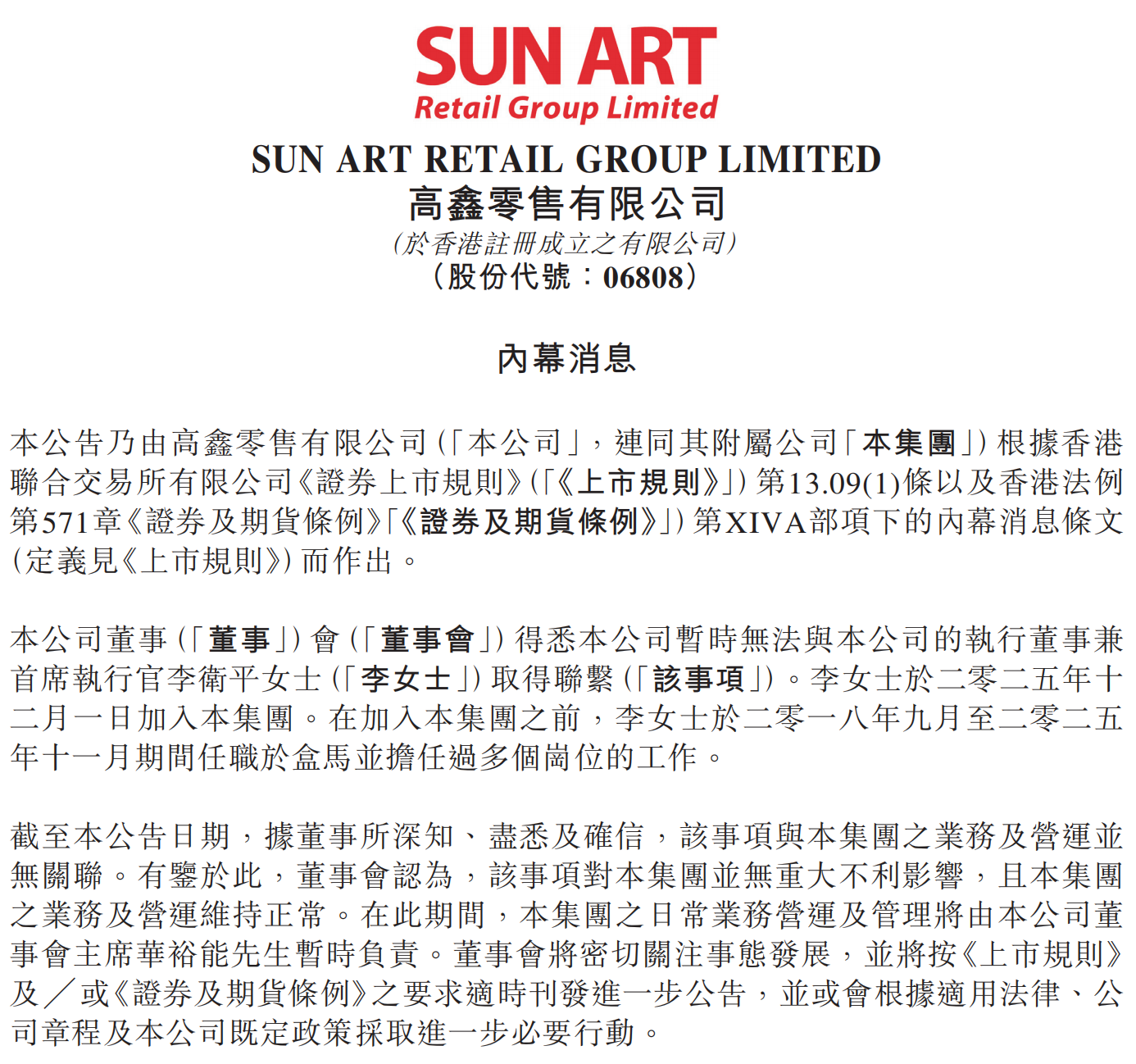 2月4日早间,港股上市公司高鑫零售发布公告称,暂时无法与公司执行董事兼首席执行官李卫平女士取得联系(简称“该事项”)。李卫平女士于2025年12月1日加入集团。在加入集团前,李卫平女士于2018年9月至2025年11月期间在盒马担任多个岗位的工作。