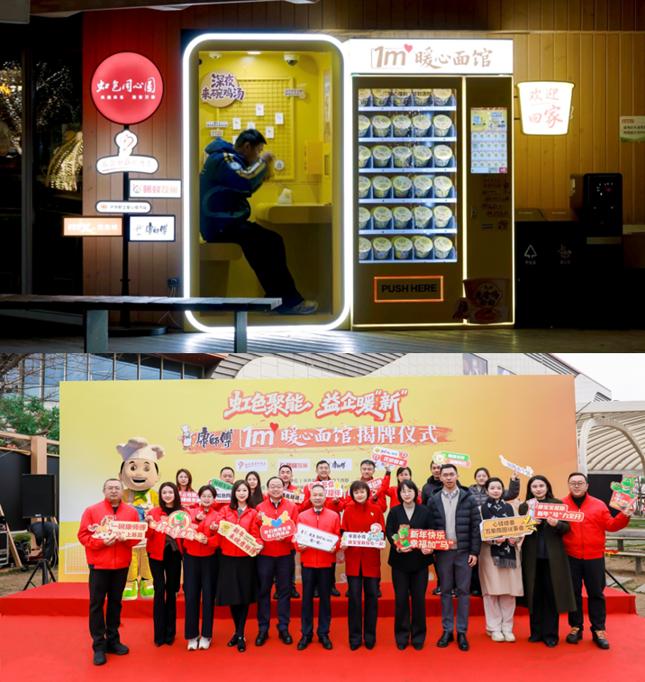 随着新业态蓬勃发展,虹桥地区的新就业群体日益庞大。1月19日,在虹桥镇“虹色聚能益起暖新”行动现场,康师傅于上海的首个“1m²暖心面馆”正式揭牌。众多商圈企业代表与社区力量齐聚,共同将这份暖意精准送达户外劳动者手中。