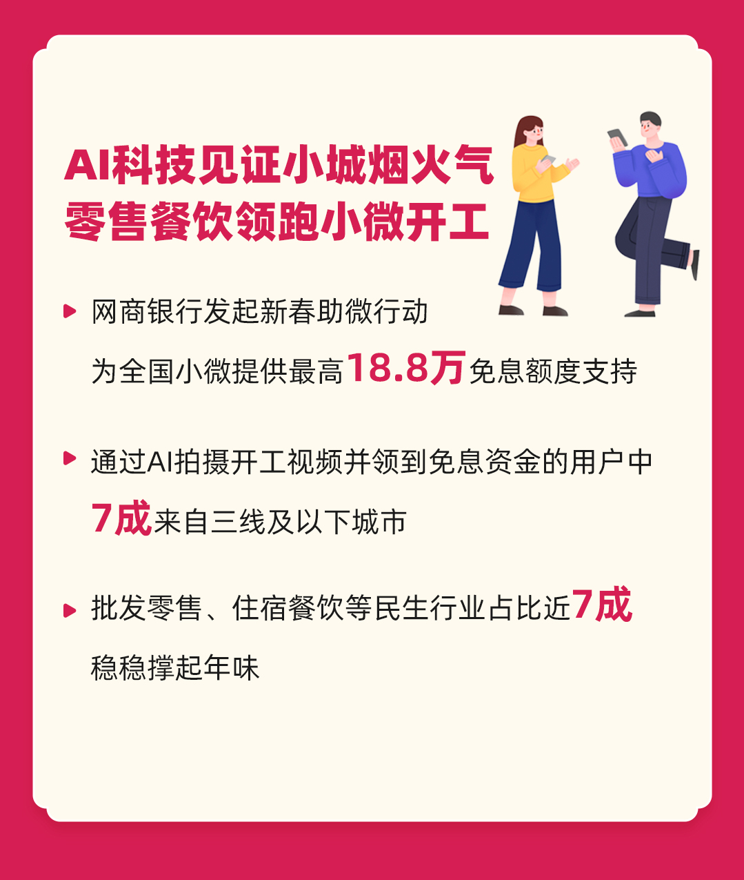 网商银行的统计数据显示,在通过AI智能速审领取免息资金的用户中,超七成来自三线及以下城市;从行业分布来看,在获得资金支持的小微经营者中,批发零售、住宿餐饮等民生行业占比近七成。值得一提的是,三线及以下城市餐饮商户营业额同比增长 36.2%,经营性贷款金额同比增长28.1%。