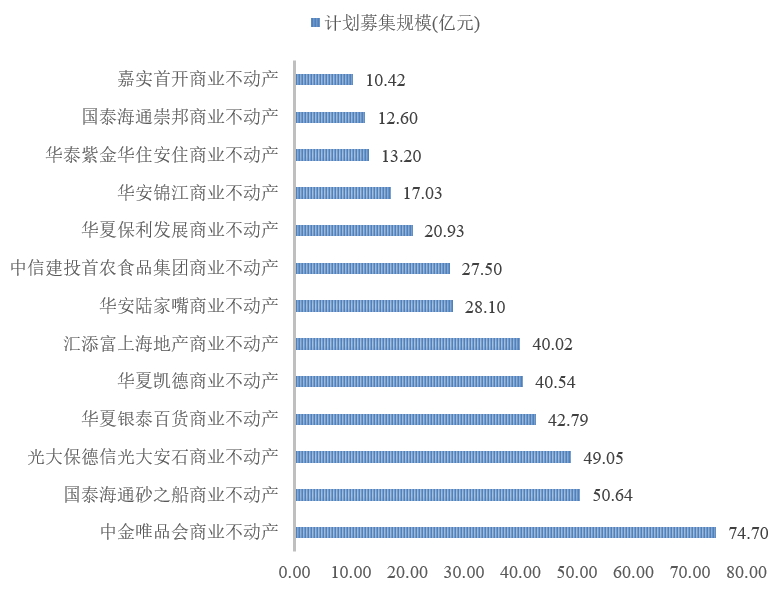 商业不动产REITs募资规模如何?截至发稿时止,已有13单商业不动产REITs披露招募说明书,每只REITs产品计划募资规模均在10亿元以上,规模合计427.52亿元。其中,中金唯品会封闭式商业不动产证券投资基金拟发行规模最大,达到74.70亿元,嘉实首开封闭式商业不动产证券投资基金拟发行规模最小,仅10.42亿元。