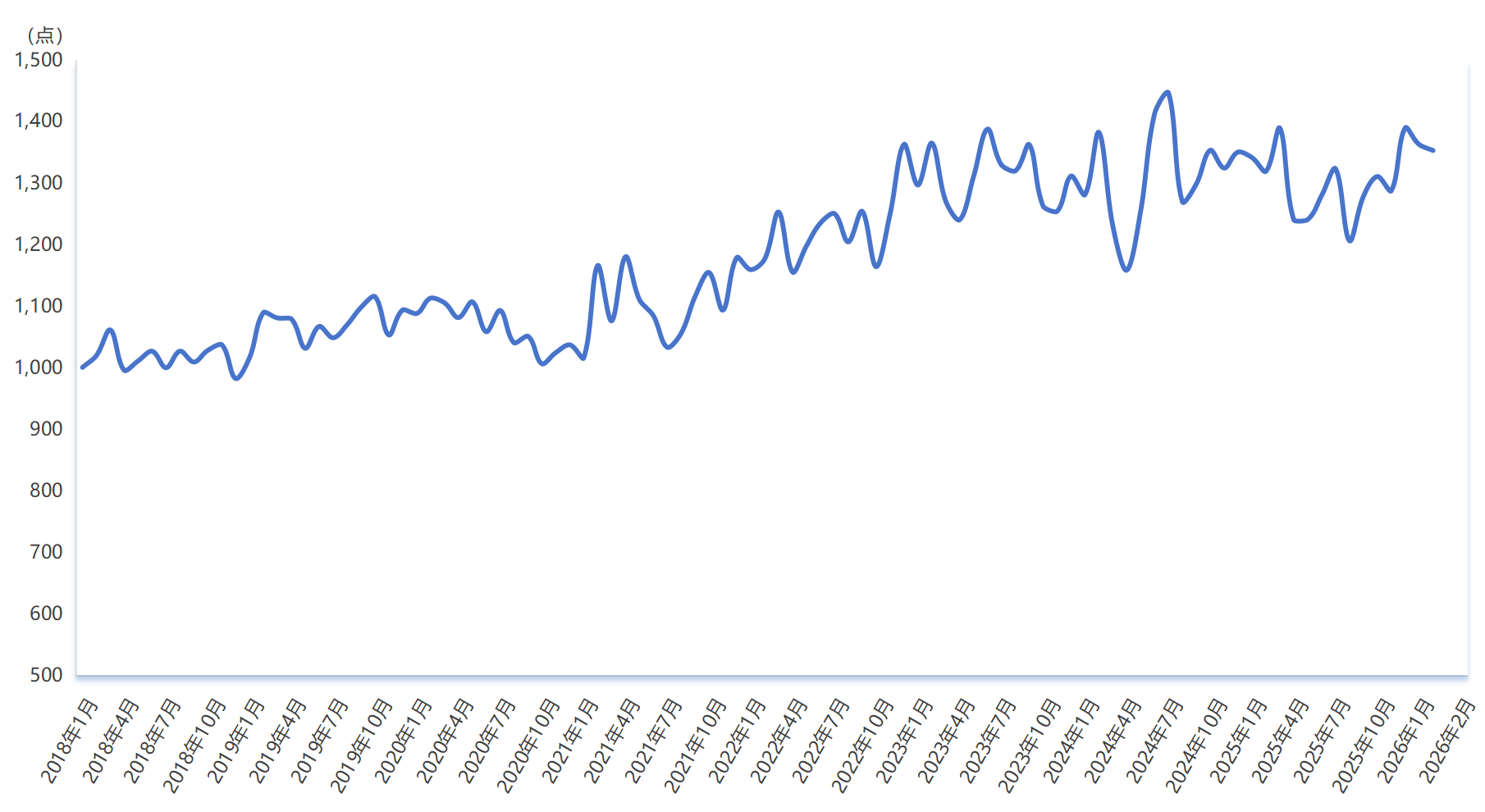 新华财经北京3月17日电(陆子琛、蒋正阳)2026年2月份,新华·中盐食用盐(商超)价格指数报1352.34点,较上期(2026年1月)下跌9.86点,跌幅0.72%;较基期(2018年1月)上涨352.34点,涨幅35.23%;较周期内最高点1445.75点(2024年7月)下跌93.41点,跌幅6.46%;较周期内最低点981.91点(2018年12月)上涨370.43点,涨幅37.73%。