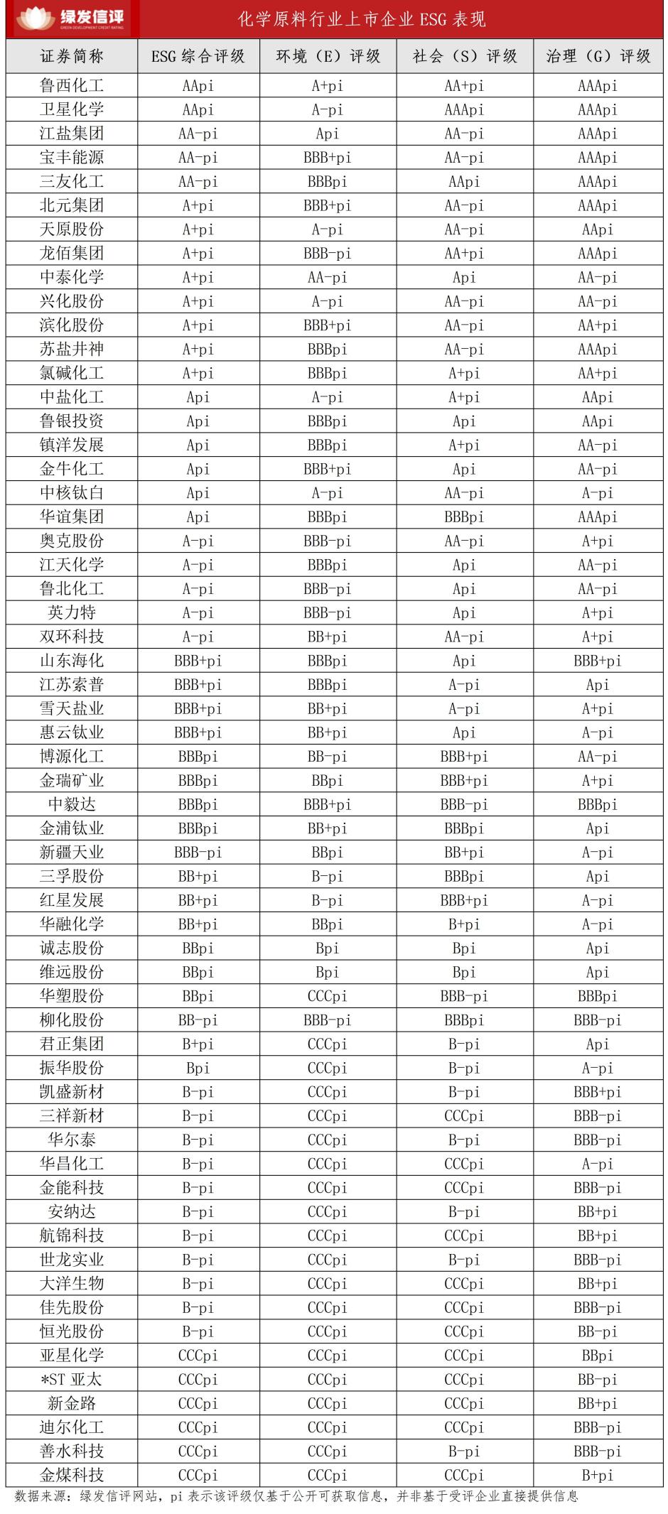 绿发信评主动评级结果显示,化学原料行业ESG评级呈现明显的梯队分化格局。鲁西化工、卫星化学获得行业领先的AApi评级,成为行业绿色转型标杆;江盐集团、宝丰能源、三友化工以AA-pi评级紧随其后,这些企业成为行业的第一梯队。