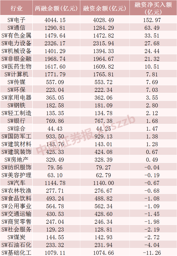 从行业情况来看,上周申万一级31个行业中有19个行业融资余额增加,电子、通信、有色金属行业融资净买入金额居前,分别为152.97亿元、63.49亿元、33.51亿元。在融资净卖出的12个行业中,基础化工、石油石化、煤炭行业融资净卖出金额居前,分别为11.26亿元、4.04亿元、2.72亿元。