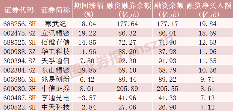 从个股情况来看,上周融资客对135只股票加仓金额超1亿元,加仓居前的10只股票分别为寒武纪、立讯精密、佰维存储、华工科技、天孚通信、东山精密、兆易创新、中信证券、亨通光电、中天科技,分别净买入19.84亿元、18.69亿元、12.63亿元、11.96亿元、11.35亿元、10.36亿元、9.71亿元、8.61亿元、7.13亿元、7.12亿元。从市场表现看,上周融资客加仓前十的股票多数上涨,涨幅最大的东山精密涨近30%。