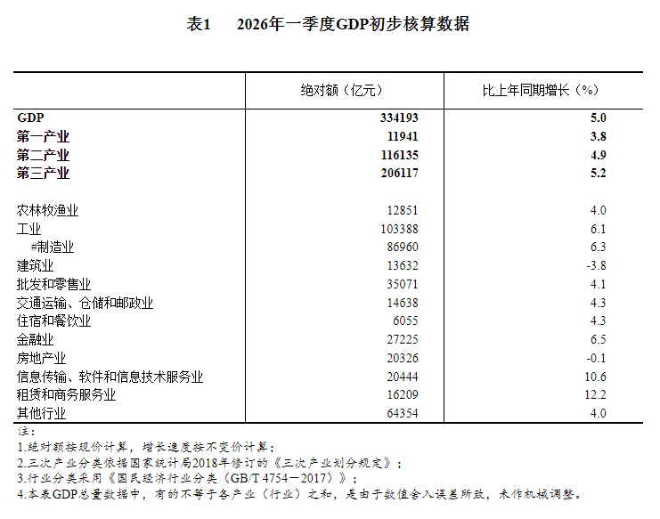 据国家统计局4月17日消息,国家统计局发布2026年一季度国内生产总值初步核算结果。其中金融业比上年同期增长6.5%,信息传输、软件和信息技术服务业比上年同期增长10.6%,租赁和商务服务业比上年同期增长12.2%。