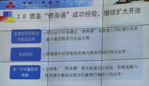 潘功胜表示,中国债券市场将会借鉴“债券通”成功经验,继续扩大开放。“我们会很快明确有关境外投资者投资境内债券市场的税收安排。另外就是回购和衍生品交易方面,我们将开放债券通下境外投资者开展回购和衍生品交易,我们将扩充报价商队伍的规模,在现有24家报价商基础上新增10家,交易手续费方面有关交易平台费用将大幅度下调,手续费降幅达50%左右。再就是与国际主流电子交易平台的合作方面,我们现在正在积极推进与其他国际主流电子交易平台的合作准备工作,前期已经做了大量的技术准备,我们希望早日能够正式的实施。”