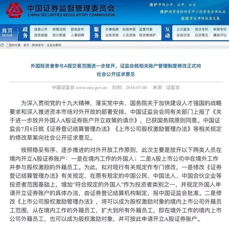 证监会今日就账户管理制度修改正式向社会公开征求意见,进一步放开外国投资者参与A股交易,在境内工作的外国人、在境外工作的境内上市公司外籍员工,无论是否在中国,都可以开立A股证券账户参与交易。