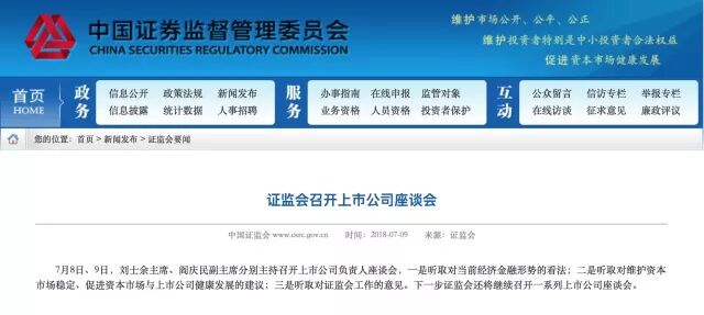 7月8日、9日,证监会主席刘士余、副主席阎庆民分别主持召开上市公司负责人座谈会。