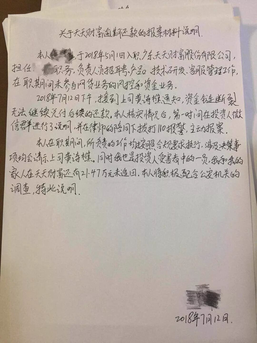 投之家关联公司内部人士的报案材料