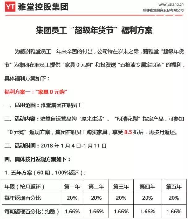 1 月4 日~1 月11 日,雅堂控股还在推出“超级年货节”,为在职员工提供“家具0 元购”和投资送“五粮液专属定制酒”的福利。