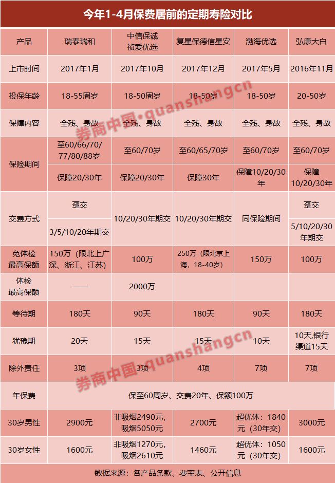 2017年以来,定期寿险成为新成立险企、中小险企和传统险企竞相推出的产品之一,具体包括,渤海人寿推出优选定期寿险、横琴人寿优爱保定期寿险,爱心人寿推出的最初两款产品之一即为定期寿险。在传统大型险企中,新华保险、泰康人寿、平安寿险等也在推出定期寿险产品。