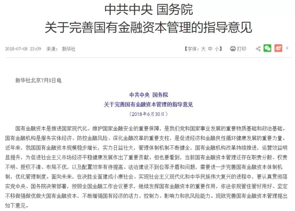 就在6月30日,国务院印发《关于完善国有金融资本管理的指导意见》。《意见》明确对国有金融资本实行集中统一授权管理,明确财政部门的管理责任,为协同整治金融乱象、打好防范化解重大风险攻坚战做努力。