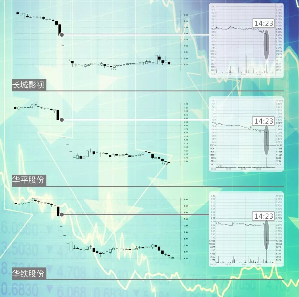 例如,长城影视、华平股份、华铁股份、华鼎股份、银亿股份、春兴精工等股票的盘中跌停步调整齐划一——几乎都在当日14时23分左右瞬间跌停。以长城影视为例,14时23分突然出现一笔7.83元(跌停价)的6126手卖单,股价瞬间跌停,跟风卖单涌现,到收盘仍一字跌停。再如,华铁股份14时22分出现11295手以跌停价挂出的卖单,将股价瞬时打到跌停板。随后几日,上述股票几乎都出现了连续跌停的状况。