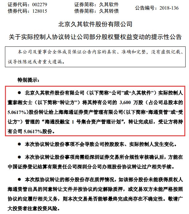 (原标题:海通资管完成股质纾困第二笔!折价约8%受让久其软件股权)