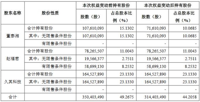本次权益变动前,董泰湘持有久其软件股份1.08亿股。本次权益变动后,受让方持有久其软件3600万股,占公司总股本的5.0617%;董泰湘持有久其软件7161万股,占公司总股本的10.0685%。董泰湘及其一致行动人赵福君、北京久其科技投资有限公司(以下简称“久其科技”)合计持有久其软件3.14亿股,占公司总股本的44.2058%,仍是公司第一大股东及实际控制人,因此本次权益变动不涉及公司控制权变更。