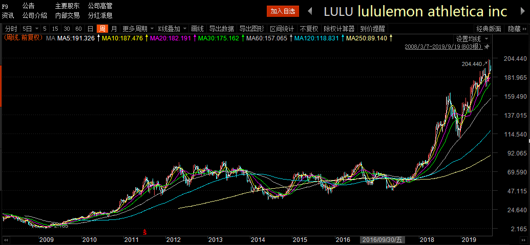 9月6日,在2019年二季度财报出炉后,露露柠檬的股价盘中触及历史新高,最终收于203.14美元,总市值超过250亿美元。