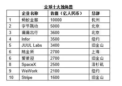 10月21日,胡润研究院在世界互联网大会上发布首份《2019胡润全球独角兽榜》(Hurun Global Unicorn List 2019),中国以206家上榜企业总数成为全球独角兽企业最多的国家,蚂蚁金服(估值1万亿人民币)、字节跳动(估值5000亿人民币)、滴滴出行(估值3600亿人民币)位居全球估值前三大独角兽。