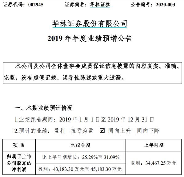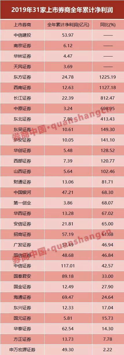 另外值得一提的是,华林证券虽然没有同比数据,但已经公布了全年业绩预增公告。预计2019年全年盈利4.3亿元至4.5亿元,比上年同期增长25.29%至31.09%。华林证券表示,资产管理业务发展迅速,产品线不断完备,成为业务增长点之一。