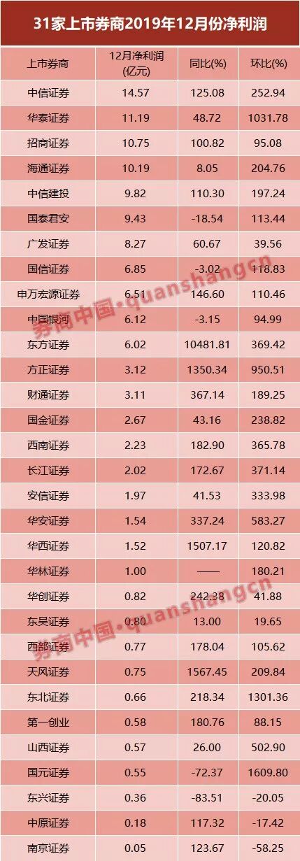 12月份:22家上市券商净利环比翻倍