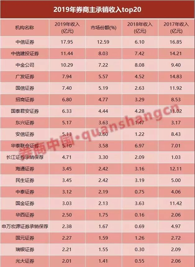 据统计,2019年,全行业共获得142.52亿元的主承销收入,较2018年的83.3亿元增加七成。其中,中信证券以17.95亿元的主承销收入排名第一,占据12.59%的市场份额;中信建投证券、中金公司主承销收入排名二、三,均超10亿元。