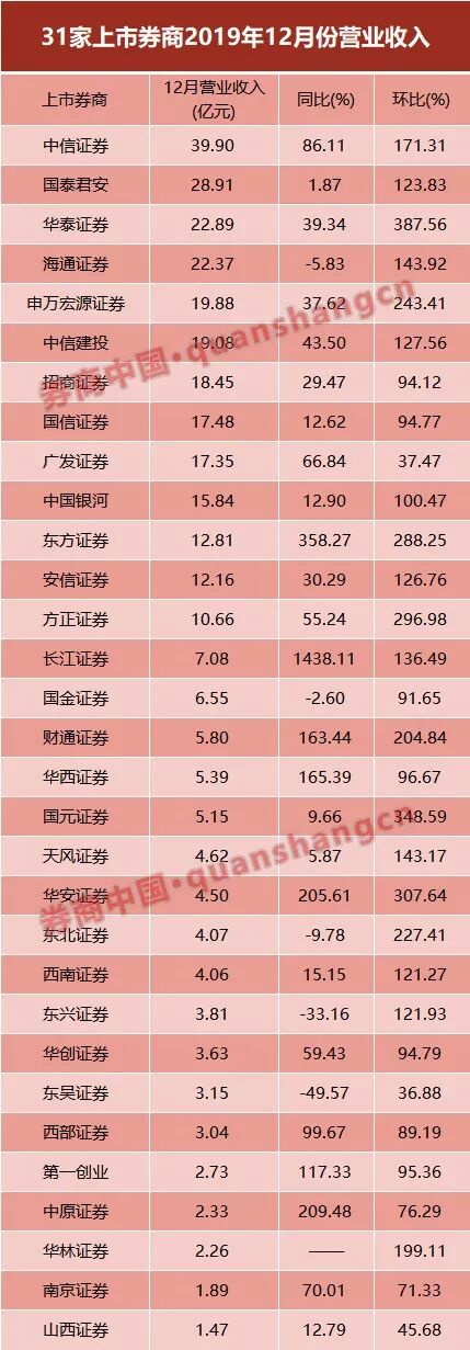 至1月9日晚8点,共有31家A股上市券商披露了2019年12月月报,单月来看,在行情回暖影响下,共有28家券商营收环比增幅超5成,22家券商净利润环比翻倍,实现2019年度“关门红”。