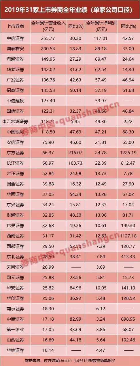 随着12月月报披露,上市券商(母公司口径)2019年全年业绩也可略窥真相。综合来看,各家券商无论营收还是净利润,同比均实现正增长。中信证券、国泰君安、海通证券稳居行业前三,其中中信证券以255亿元营收、117亿元净利润遥遥领先,增幅明显。由于此次统计数据系母子分开数据,按照往年惯例,其合并报表数据仍有提升。