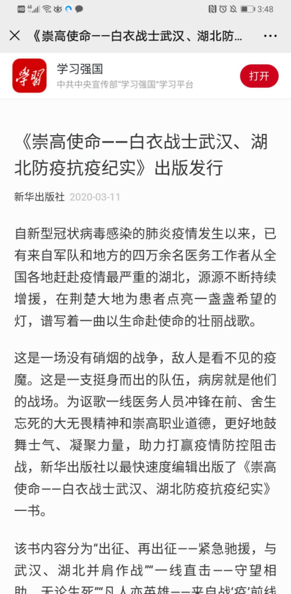 近日,“学习强国”平台转发了《崇高使命——白衣战士武汉、湖北防疫抗疫纪实》一书出版发行的消息。