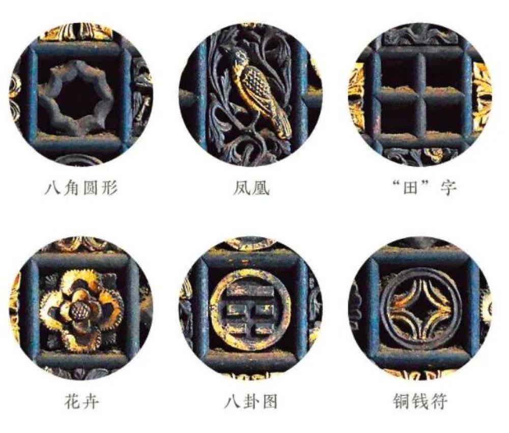 此扇槛窗居中是一只凤凰,四周有各种不同的禽鸟和花卉,以及“田”字、八角圆形和铜钱符,寓意为“百鸟朝凤”“花开富贵”“良田万顷”“八方来财”。