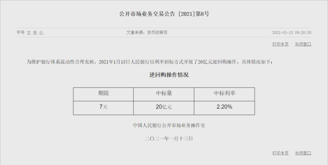央行于13日早间披露,当日以利率招标方式开展了20亿元逆回购操作。