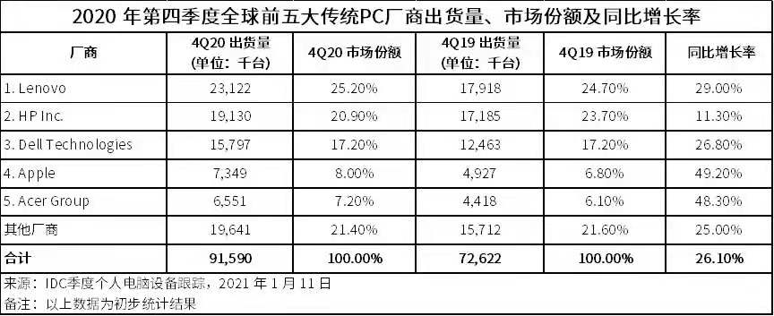 目前,联想集团是全球最大的个人电脑公司。国际数据公司IDC报告显示,2020年第四季度,全球个人电脑前五大厂商中,联想集团出货量达2312.2万台,排名保持全球第一,同比增长29%,全球市场份额上升至25.2%。