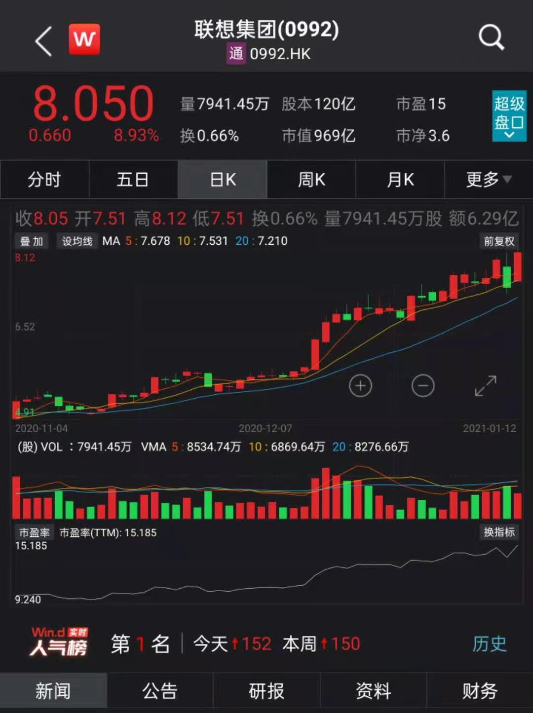 Wind数据显示,截至1月12日收盘,联想集团港股涨8.93%,报8.050港元,总市值969亿港元。